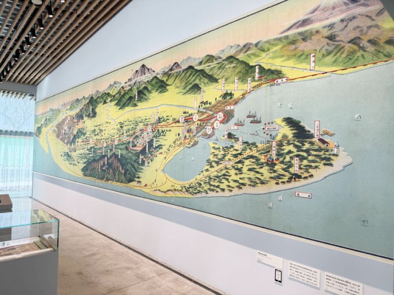 「館内には、東海道を“ひとめ”で見渡せる漆芸作品『東海道五十三次ひとめ図』も設置されています。静岡の伝統工芸を今に伝える蒔絵師、塗師、指物師の皆さんによる2×3mの大きな作品です。」
